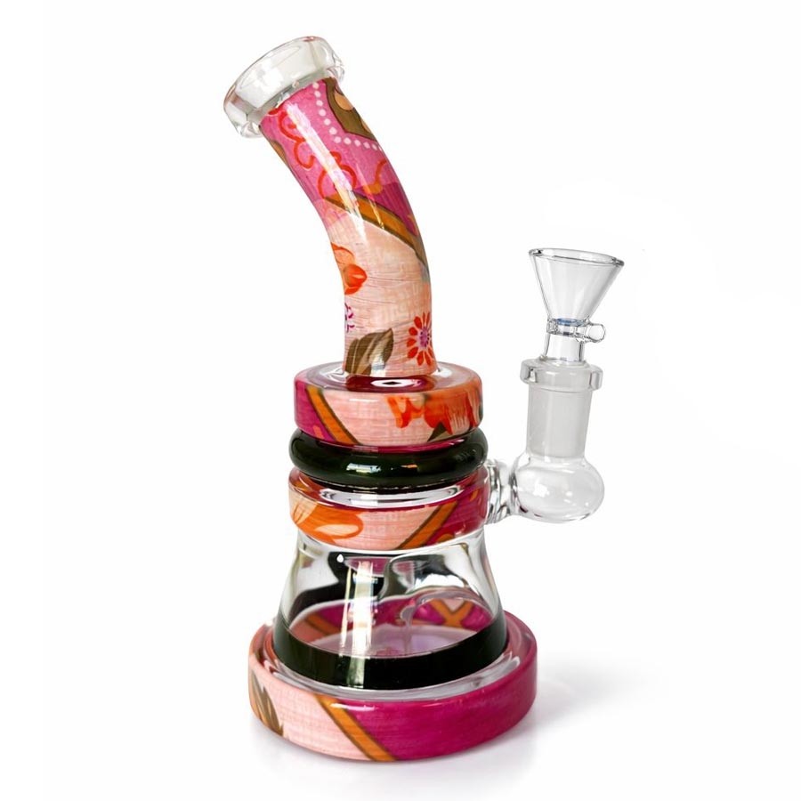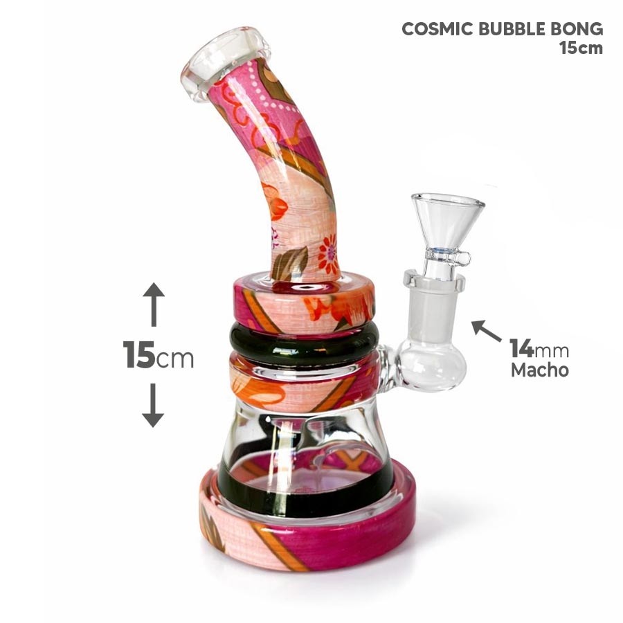 El Cosmic Bubble Bong de 15 cm destaca por su diseño multicolor con motivos florales, combinando estética llamativa y original con materiales de alta calidad. Fabricado en vidrio borosilicato resistente, ofrece durabilidad, soporte para altas temperaturas y facilidad de limpieza, manteniendo su integridad incluso con uso continuado.