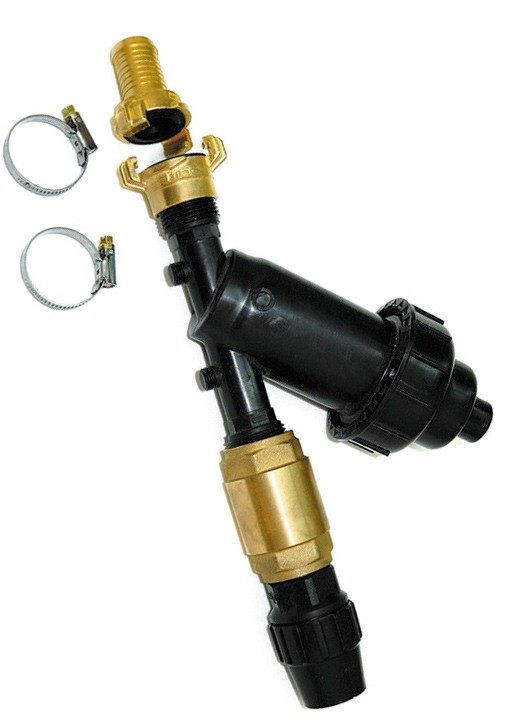 Filtro + conexiones 25 mm a 1". Este conjunto se compone de 2 bridas para manguera, 1 filtro de malla, 1 válvula antirretorno, 1 unión rápida Geka rosca hembra, 1 unión rápida Geka manguera 25 mm y enlace rosca macho 1”x 25 mm.