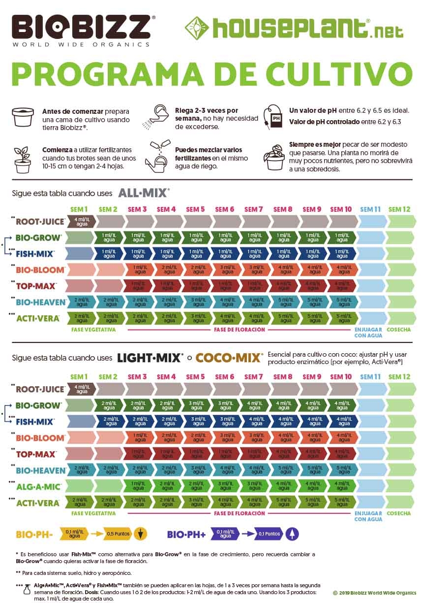 En la descripción del producto encontrarás también la tabla de cultivo de BioBizz, que recomendamos seguir paso a paso y a pie de la letra.
